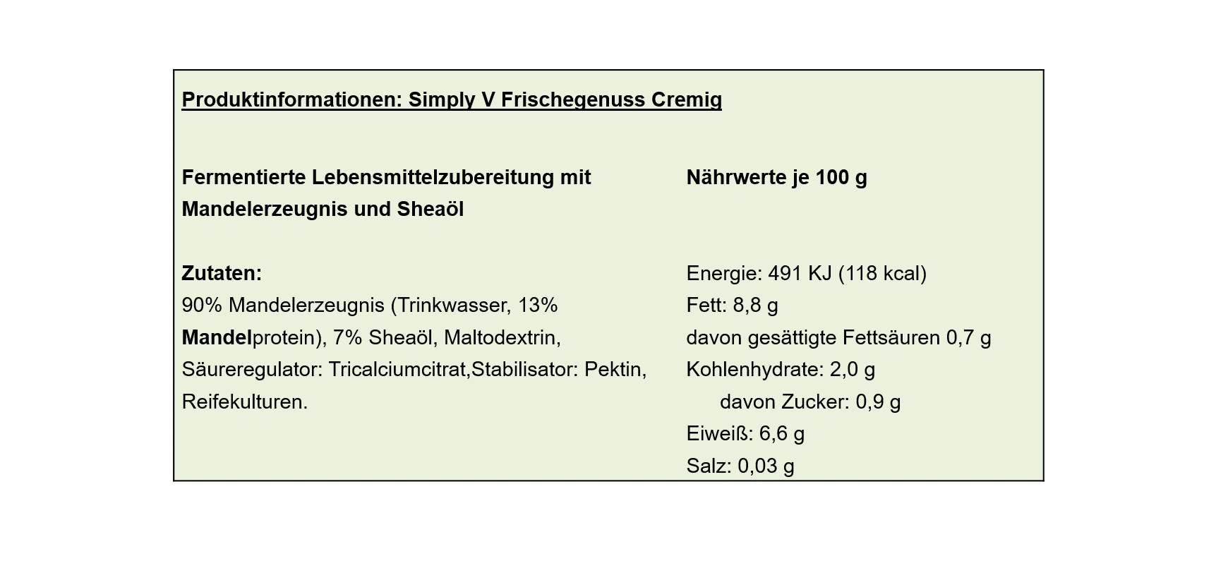 Der Simply V Frischegenuss hat den frischen typischen Geschmack sowie die Konsistenz von Quark und kann auch ebenso verwendet werden. Er ist reich an wertvollem Mandelprotein, dabei ungesüßt, komplett milchfrei und wird ohne Soja und ohne Palmöl hergestellt. Erhältlich in zwei Fettstufen, kann zwischen cremig mit 9% Fett oder leicht mit 1,8% Fett gewählt werden. Da er 100 % pflanzlich und somit milchfrei ist, ist er auch frei von Milcheiweiß und Laktose. Menschen mit entsprechenden Unverträglichkeiten oder Allergien können ihn beschwerdefrei genießen. Da bei der Herstellung keine glutenhaltigen Zutaten verwendet werden, ist er ebenso beim Vorliegen einer Zöliakie ein geeignetes Lebensmittel.