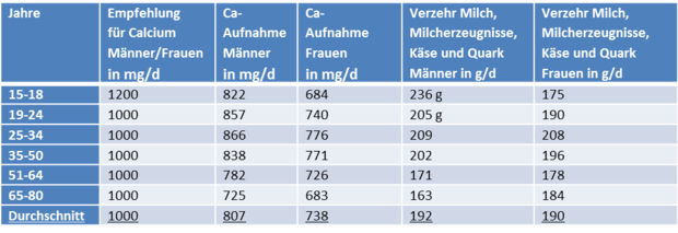 Mittlere Verzehrsmengen von Calcium, Milch und Milchprodukten in Deutschland