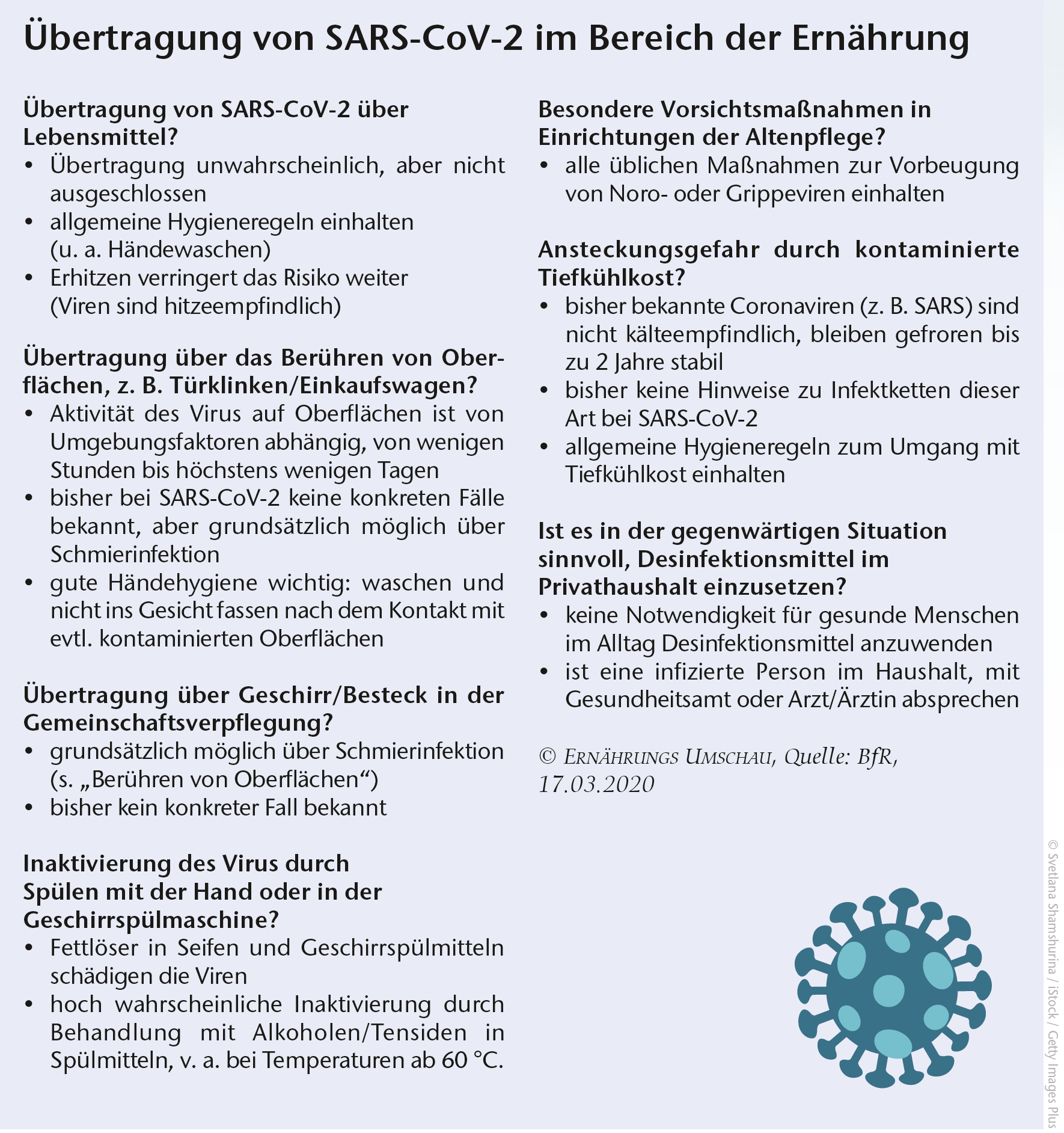 Quelle: Bundesinstitut für Risikobewertung: Aktualisierte Fragen und Antworten des BfR vom 17. März 2020. www.bfr.bund.de/cm/343/kann-das-neuartige-coronavirus-ueber-lebensmittel-und-gegenstaende-uebertragen-werden.pdf (last accessed on 23 March 2020).