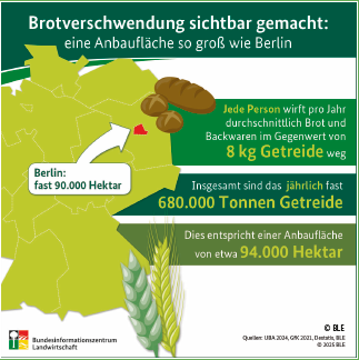 Ein Hektar Ackerfläche liefert im Schnitt rund 7,2 Tonnen Brotgetreide. Das bedeutet, dass jährlich etwa 94000 ha Anbaufläche bewirtschaftet werden, um die Menge an Brotgetreide zu erzeugen, die letztlich als Brot und Backwaren im Müll landet.