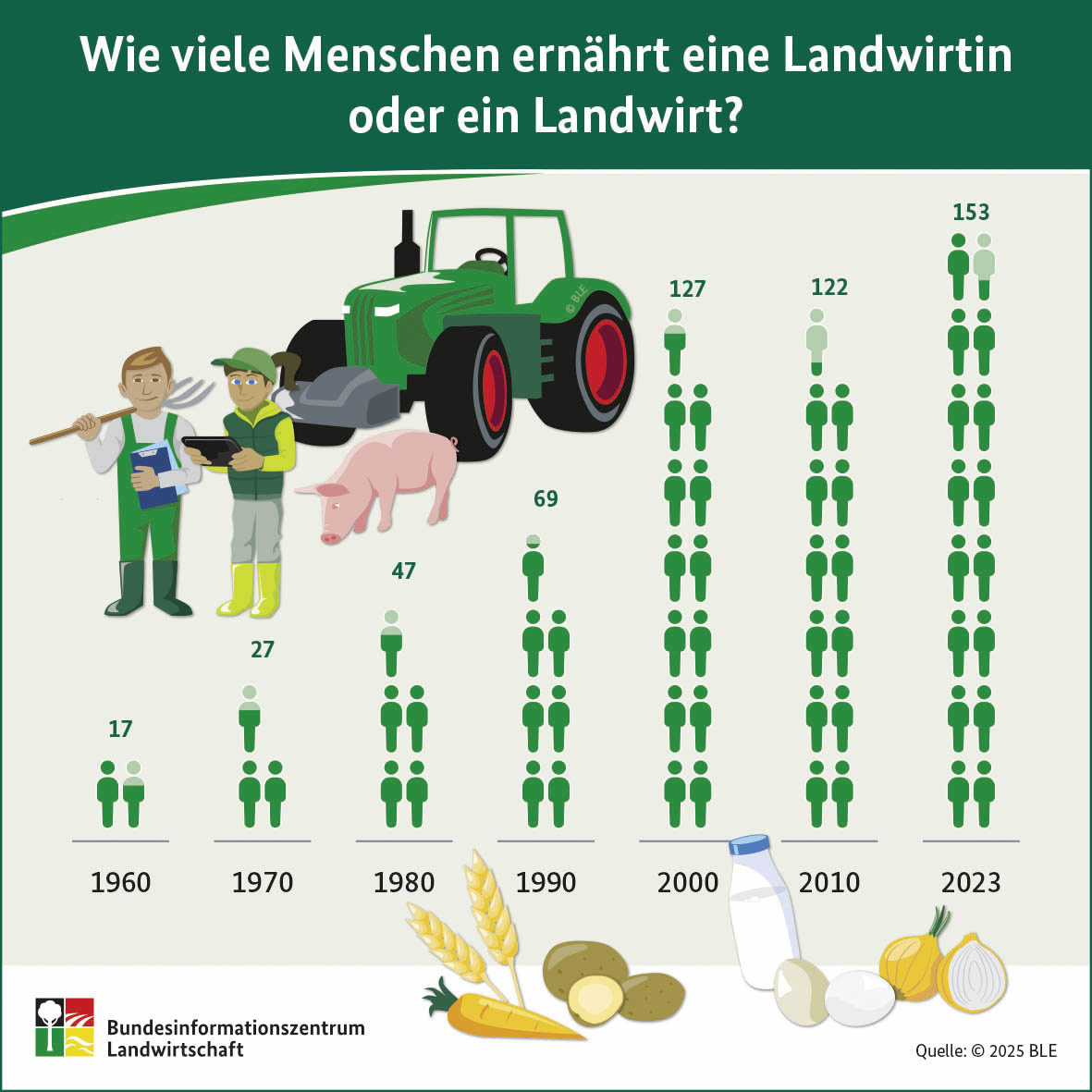 Ermittelt wird die Zahl, indem die Nahrungsmittelproduktion durch die in der Landwirtschaft vollzeitig beschäftigten Arbeitskräfte und der Verbrauch durch die Zahl der in Deutschland lebenden Menschen geteilt wird. Setzt man die so errechneten Werte für Nahrungsmittelproduktion und Verbrauch pro Kopf in Relation, erhält man die Zahl der Menschen, die ein Landwirt oder eine Landwirtin ernähren kann.