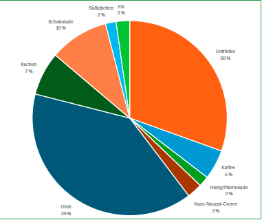 Den größten Anteil am Gesamtzuckerkonsum hatten Obst (39 %) und Erfrischungsgetränke (30 %) (• Abbildung 2). 80 % der NFS (n = 63) konsumierten im beobachteten Zeitraum zuckerhaltige Erfrischungsgetränke. 15 der teilnehmenden NFS nahmen die täglich als akzeptabel angesehene Menge Zucker allein durch Erfrischungsgetränke zu sich. Hieraus ergab sich ein signifikanter (p = 0,004) positiver Zusammenhang Φ = 0,268. Es konnte kein Zusammenhang zwischen der Verwendung von light-Produkten und einer höheren Qualifikation gefunden werden.